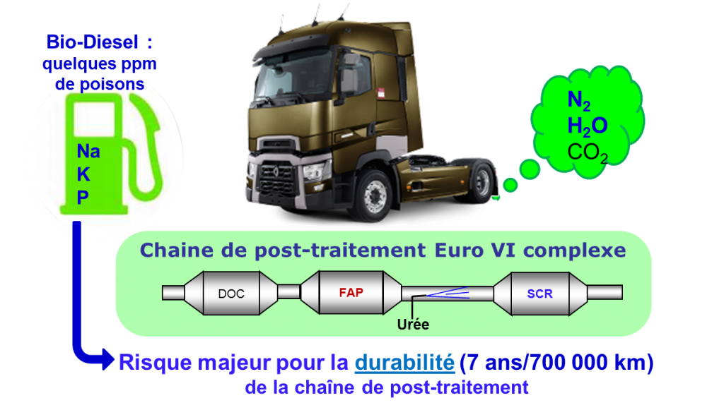 La norme Euro VI (2014) pour les poids lourds implique la mise en œuvre d’un système de post-traitement des gaz d’échappement complexe, intégrant à la fois un catalyseur d’oxydation (DOC), un catalyseur de réduction sélective des NOx (SCR), et un filtre à particules (FAP), avec une durabilité exigée de 7 ans / 700 000km. Parallèlement, il existe des gammes de véhicules homologués B100 fonctionnant exclusivement au biodiesel. Or, ce carburant contient des traces de métaux alcalins (Na, K) ou phosphore (P) qui sont des poisons potentiels pour la chaine de post-traitement. En prenant en compte la durabilité exigée de 700 000 km, il apparait que la chaine de post-traitement va être soumise à plusieurs kilos de poisons, ce qui induit un risque majeur pour sa durabilité.