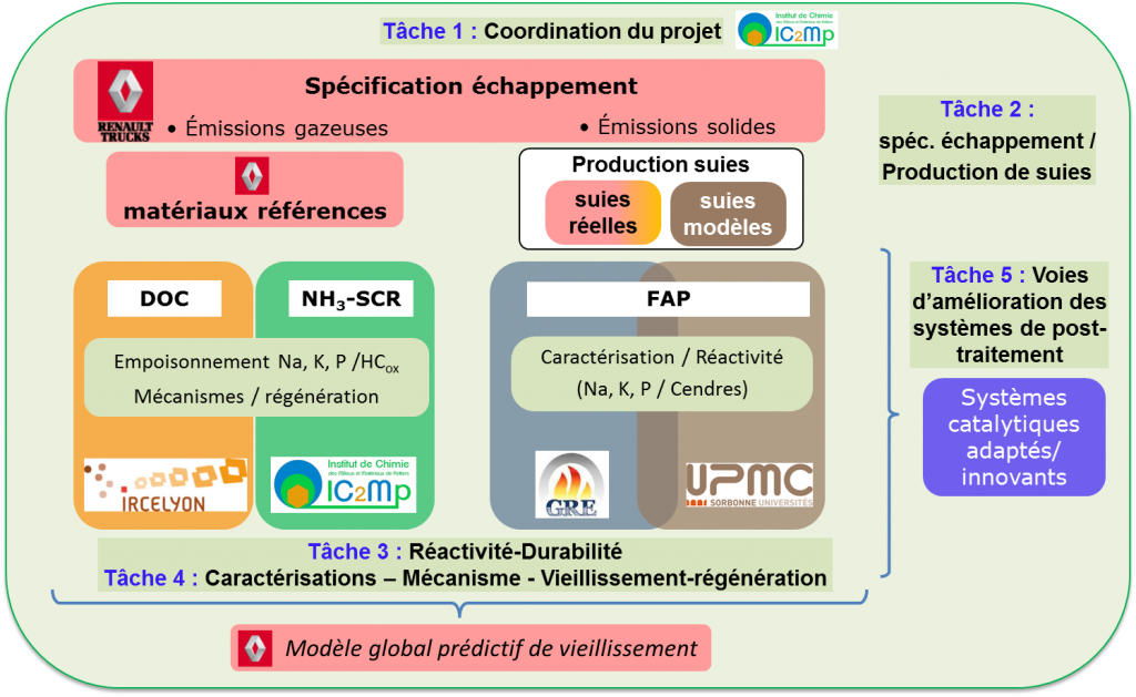 Pour mener à bien ce projet nécessitant des compétences multiples, un consortium permettant un travail collaboratif a été constitué. Il regroupe un constructeur de poids-lourds (Renault Trucks) et quatre laboratoires académiques des Universités de Paris (Institut Jean le Rond d’Alembert, IJLRA), Poitiers (Institut de Chimie des Milieux et des Matériaux de Poitiers, IC2MP), Mulhouse (Laboratoire de Gestion des Risques et Environnement, LGRE) et Lyon (Institut de Recherche sur la Catalyse et l’Environnement de Lyon, IRCELYON).