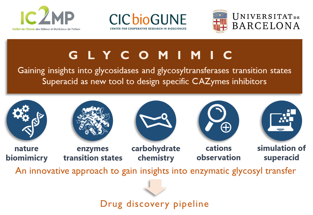 The IRP GLYCOMIMIC is a joint research program between IC2MP (UMR CNRS 7285 / Univ. Poitiers), the University of Barcelona (Spain, Pr. C. Rovira) and the Center for Cooperative Research in Biosciences (CICbioGUNE, CIC, Spain, Pr. J. Jiménez Barbero). Its main objective is to assist the design of specific CAZymes inhibitors for therapeutic and biotechnological purposes in need of action by developing an innovative superacid-based approach to gain insights into Carbohydrate Active enZymes transition states.