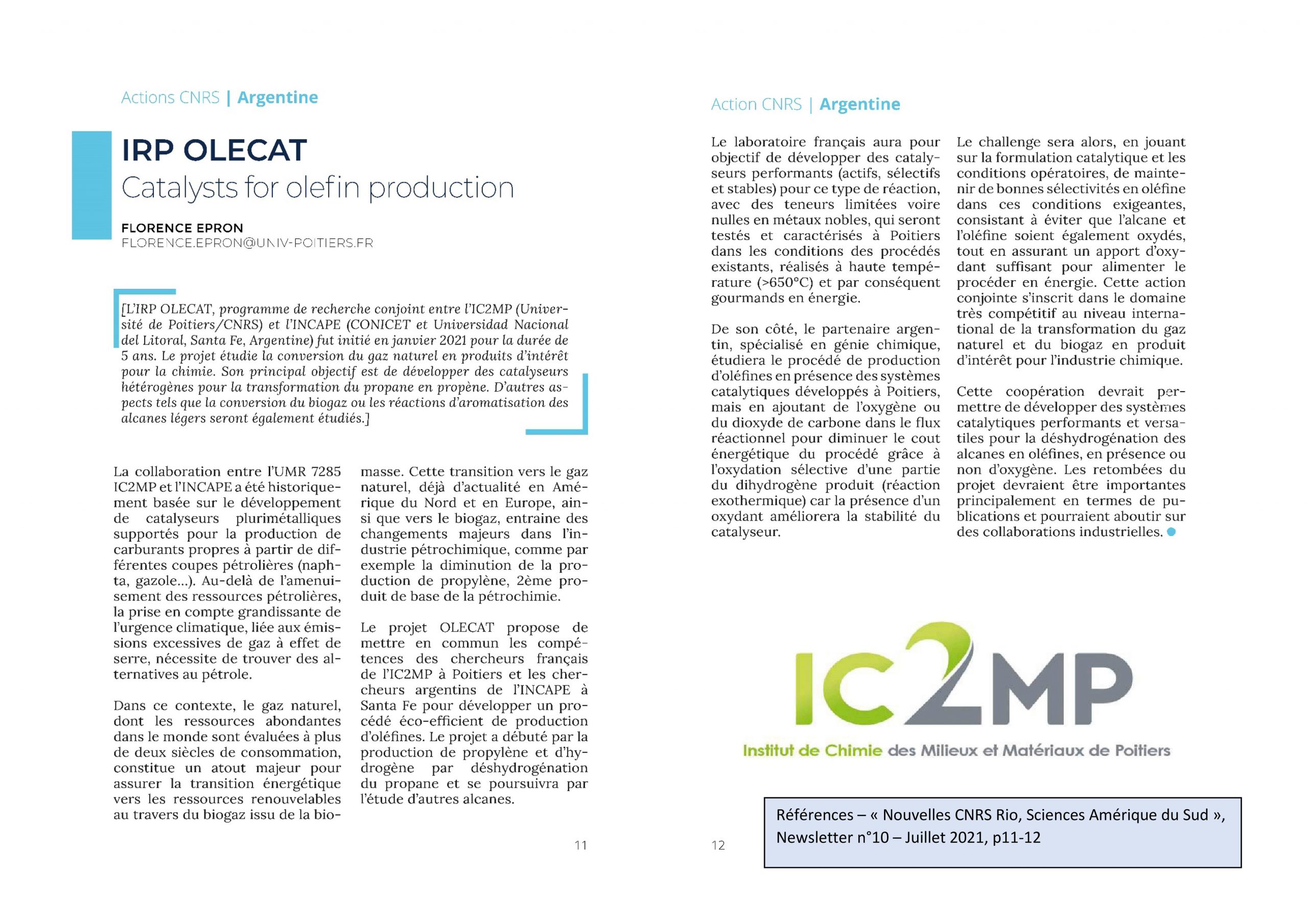 The IRP* (International Research Program), joint research program between IC2MP (Université de Poitiers/CNRS) and INCAPE (CONICET and Universidad Nacional del Litoral, Santa Fe, Argentina) is based on the conversion of natural gas into products of interest for chemicals. Its main objective is to develop heterogeneous catalysts for the transformation of propane into propene. Other aspects such as the conversion of biogas or the aromatization reactions of light alkanes are also envisaged.